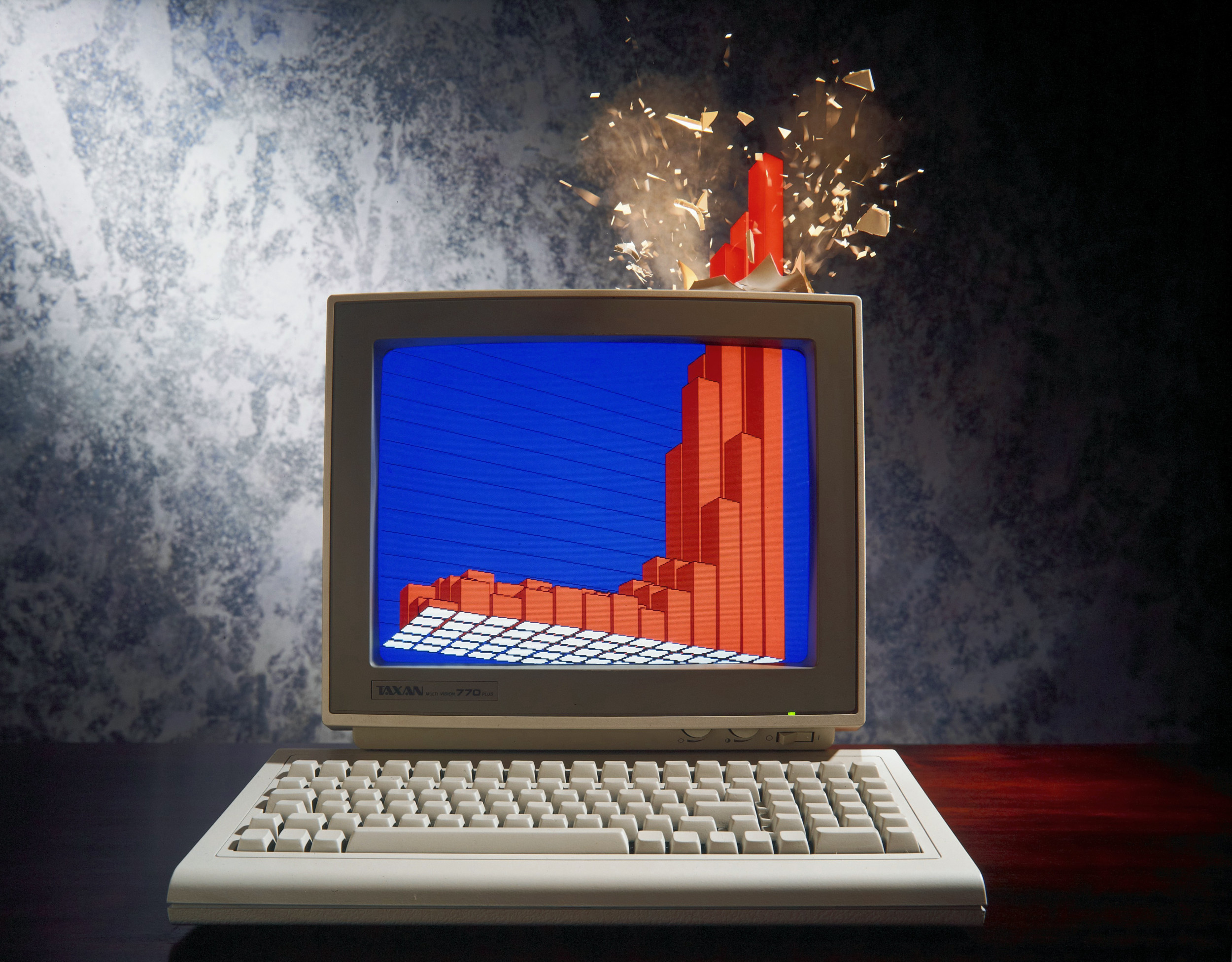 The electronics I learned in the Army gave me the knowledge to build high speed triggering systems and delaying timers. To create the image “Bull Market” I rigged Perspex models and fragments on top of a working computer monitor. Broken bits were then stuck on or hung from above on invisible tungsten wire. When all was ready, a blast of compressed air launched dust and paper fragments through the set. The air also initiated a timing sequence which fired the flashes a few milliseconds later. It took about a week to set up, test and shoot. “Reversal of Fortunes” was similar although the oversized set was much more complicated.