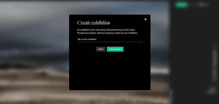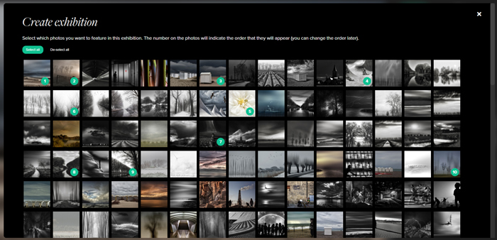Name your new exhibition and then click "Select photos". Select all photos you want to include in the exhibition. Numbers will indicate how many photos are selected. When you are done click "Create".